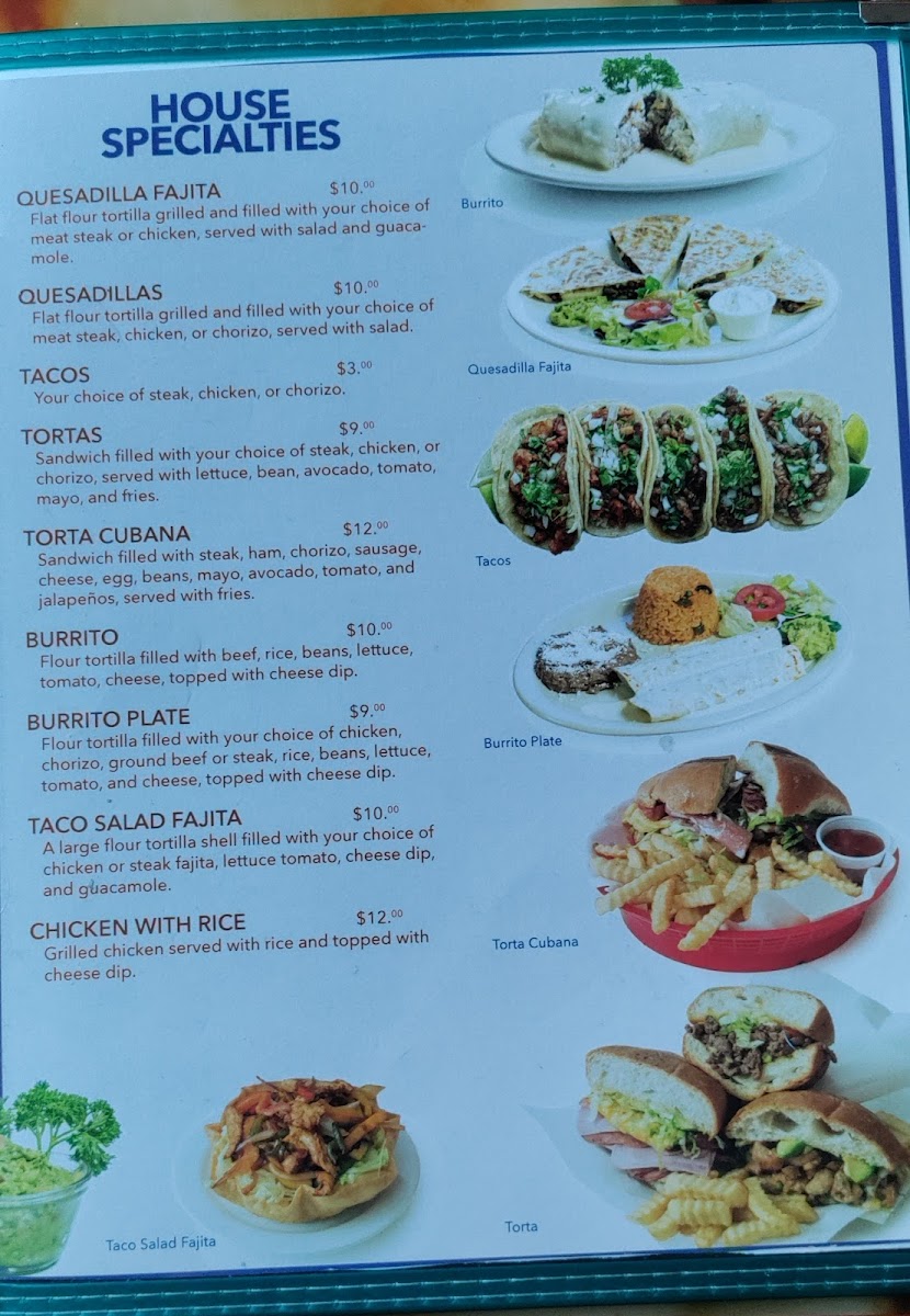 Flat flour tortilla grilled and filled with steak, chicken, pork or chorizo, served with salad